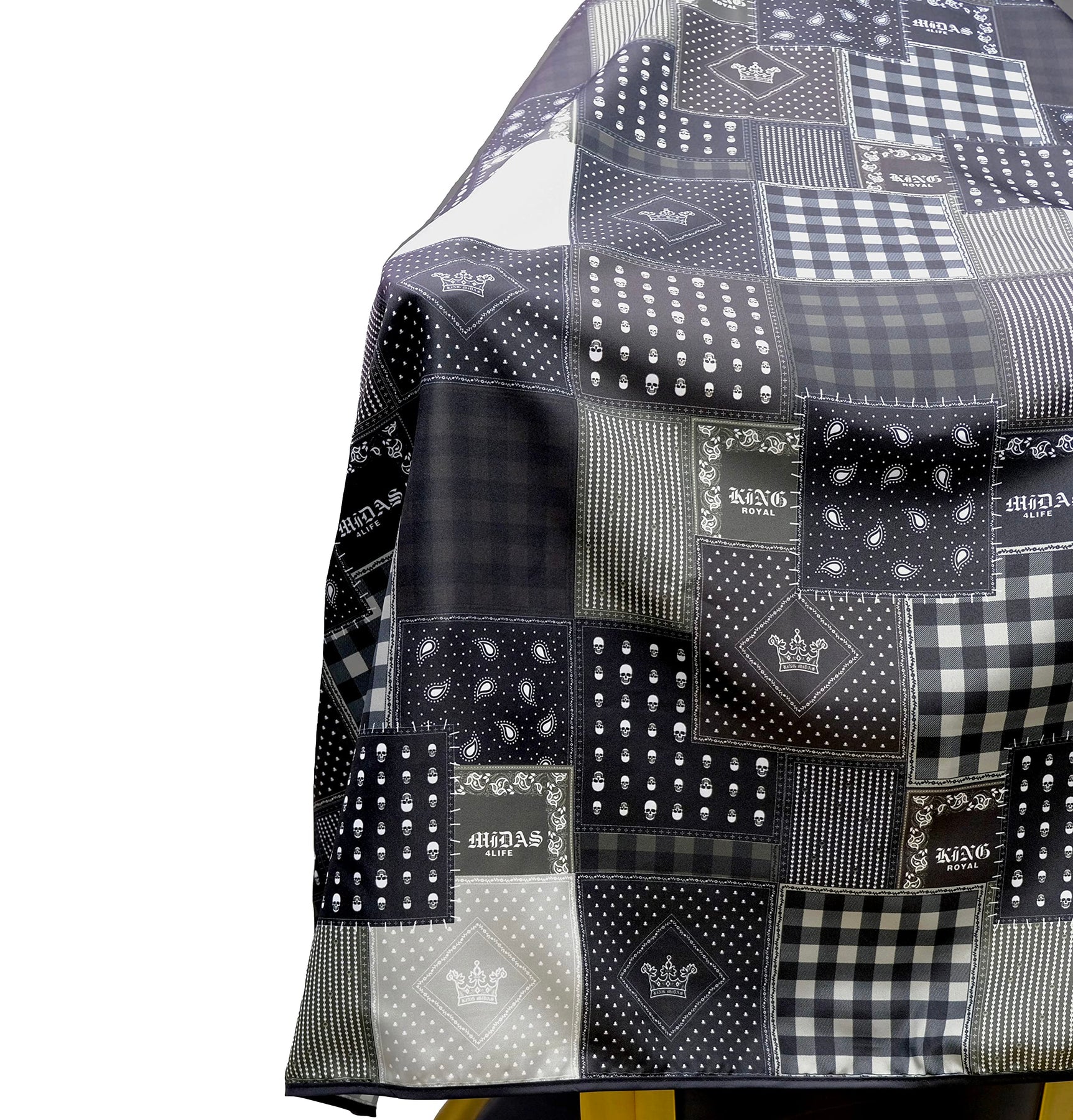 Introducing the King Midas Barber Cape - the ultimate accessory for barbers and hairstylists seeking excellence in their craft. Crafted with precision and designed for convenience, this hair-cutting cape redefines the salon experience. King Midas takes pride in engineering a barber cape that not only delivers impeccable results but also prioritizes the comfort of your clients. Our innovative design ensures maximum comfort, making each haircutting session a breeze. The quick-dry and easy-clean features transform the post-cutting cleanup, allowing you to focus on what truly matters - your artistry. Fashioned from premium soft material, this barber cape exudes durability that stands the test of time. Whether you're a seasoned barber or a DIY enthusiast, this cape caters to your needs with elegance and style. Tired of post-cut hair lingering around? The King Midas hair cutting cape boasts ultra-lightweight, soft material that not only shields against water but also thwarts hair with finesse. Revolutionize your hair cutting experience with a cape that complements your technique while keeping stray hairs at bay. No two necks are the same, and we acknowledge that. The King Midas barber cape is equipped with an adjustable neck snap button, ensuring a snug fit for clients of all ages. Crafted with this unique mechanism, hair remains where it belongs - off your clients' clothes. Elevate your salon's reputation with the King Midas Barber Cape. Designed to provide unrivaled coverage, this cape ensures a clean and tidy experience for your clients, leaving their attire spotless even after the most intricate haircuts or styling sessions. In a world where excellence matters, the King Midas Barber Cape reigns supreme. Elevate your salon experience, enhance your cutting finesse, and redefine the comfort of your clients - all with one exceptional cape. Experience the transformation today and discover what it truly means to wield the touch of a king.